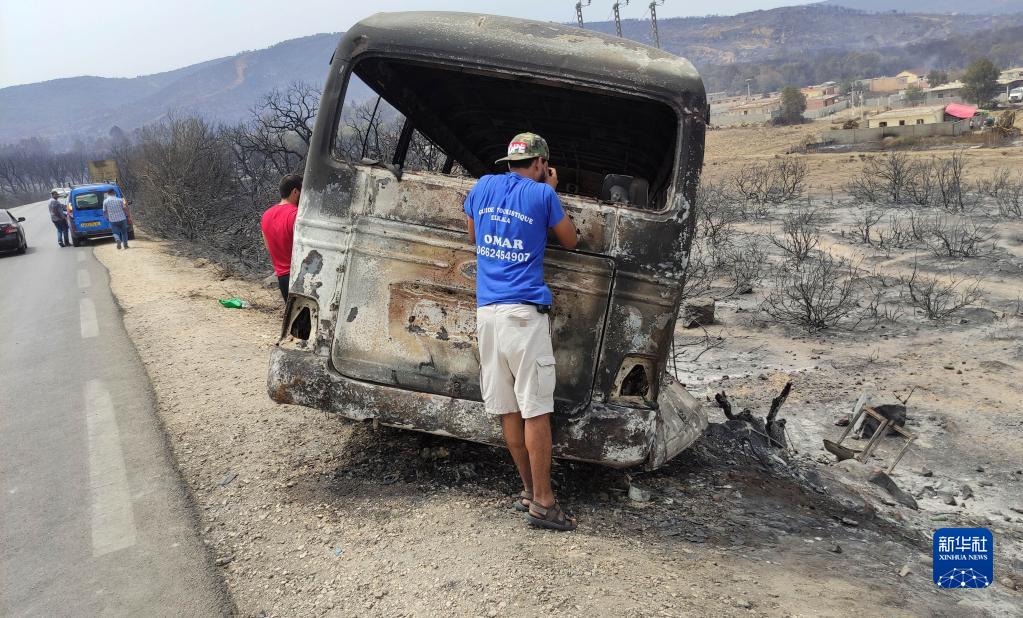8月18日,在阿爾及利亞泰賴夫省,車輛被森林火災焚毀。