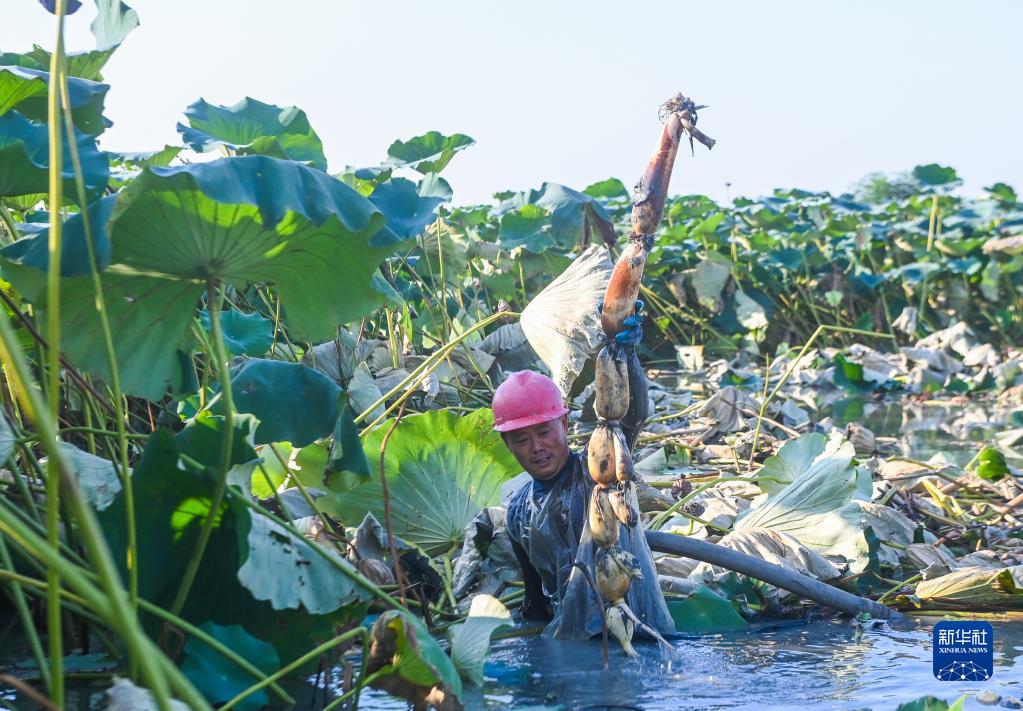 8月19日,種植戶在藕塘里收獲新鮮的蓮藕。
