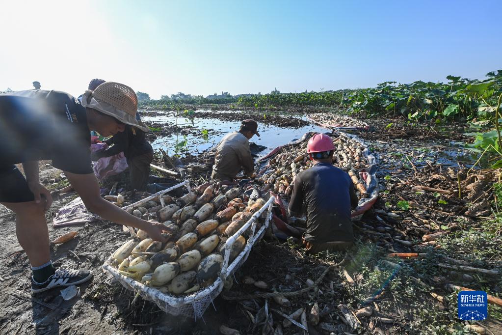 8月19日,種植戶把收獲的新鮮的蓮藕進行稱重打包。