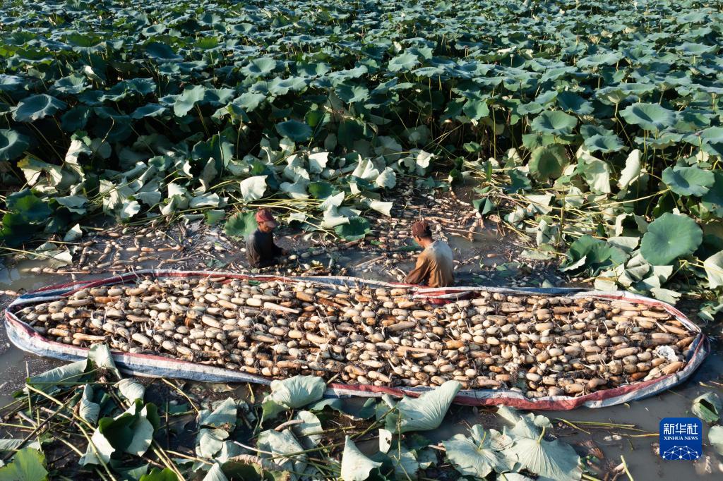 8月19日,種植戶在藕塘里收獲新鮮的蓮藕(無人機照片)。