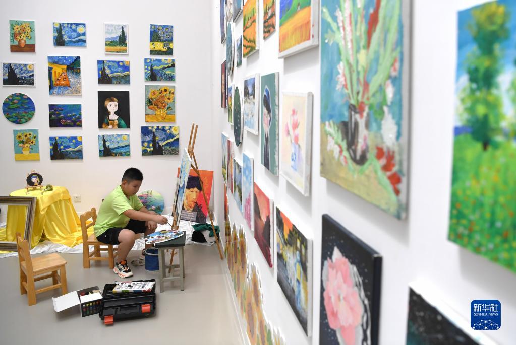 8月19日,合肥市六安路小學翠微分校的學生在繪畫作品展示區創作。