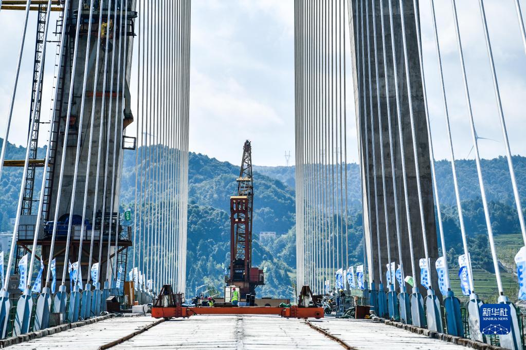 8月19日,工人在合龍后的貴州龍里河大橋上對附屬工程進行施工。