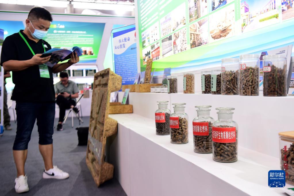 8月19日,與會者在2022安徽秸稈暨畜禽養殖廢棄物綜合利用產業博覽會上了解用秸稈制作的生物質燃料。