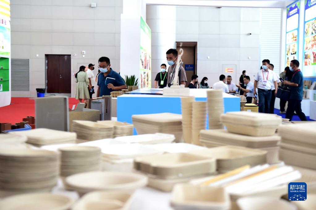 8月19日,與會者在2022安徽秸稈暨畜禽養殖廢棄物綜合利用產業博覽會上觀看秸稈餐具。