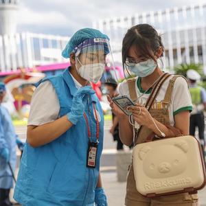 8月18日,??诿捞m國際機場的服務專員引導滯留旅客查詢健康信息。