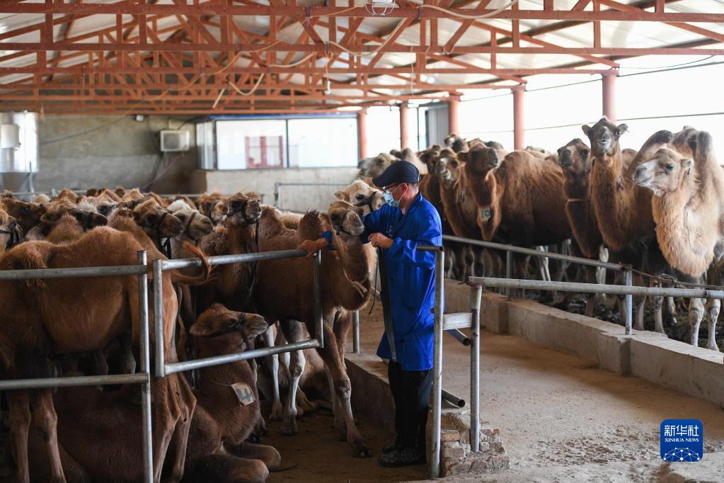 8月18日,蘇尼特右旗雙峰駝繁育養殖基地職工馬拉慶夫在棚圈里查看駱駝。