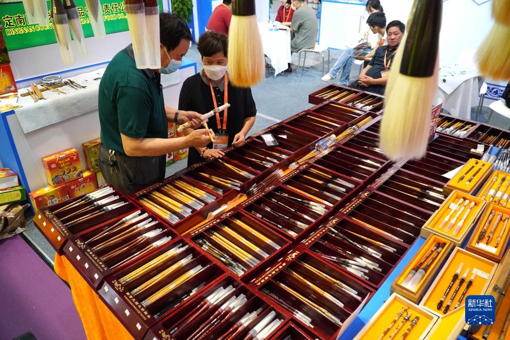 8月19日,在第六屆中華老字號(山東)博覽會江西展區,參觀者在觀看毛筆類展品。