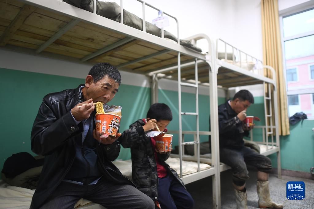 8月18日,來自青山鄉龍臥村的全海山(左)在大通一中臨時安置點宿舍內吃晚餐。