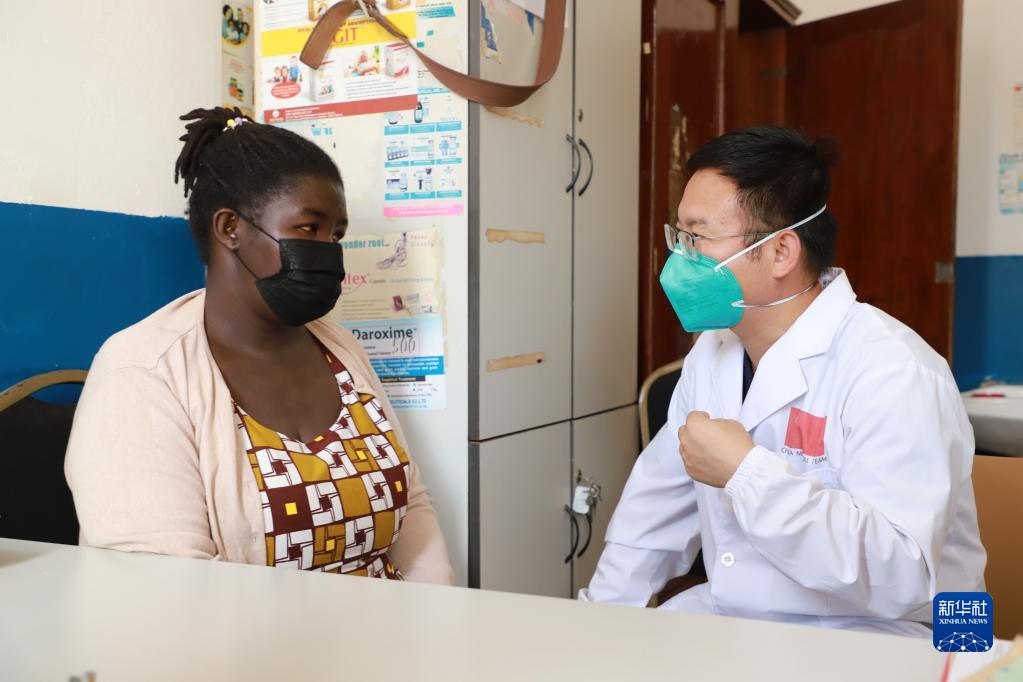 8月19日,在烏干達首都坎帕拉的中烏友好醫院,甲狀腺乳腺外科醫生張輝(右)為患者做診療。