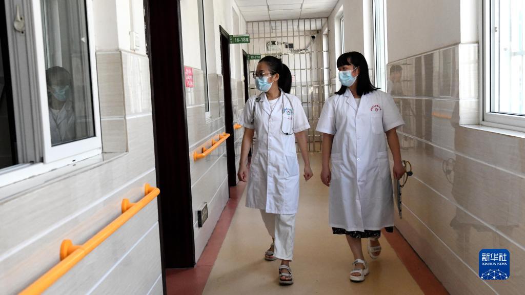 在融安縣長安鎮衛生院,李秋菊(左)和同事在查房(8月19日攝)。