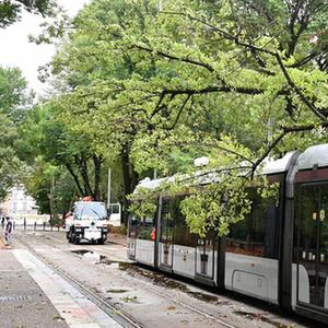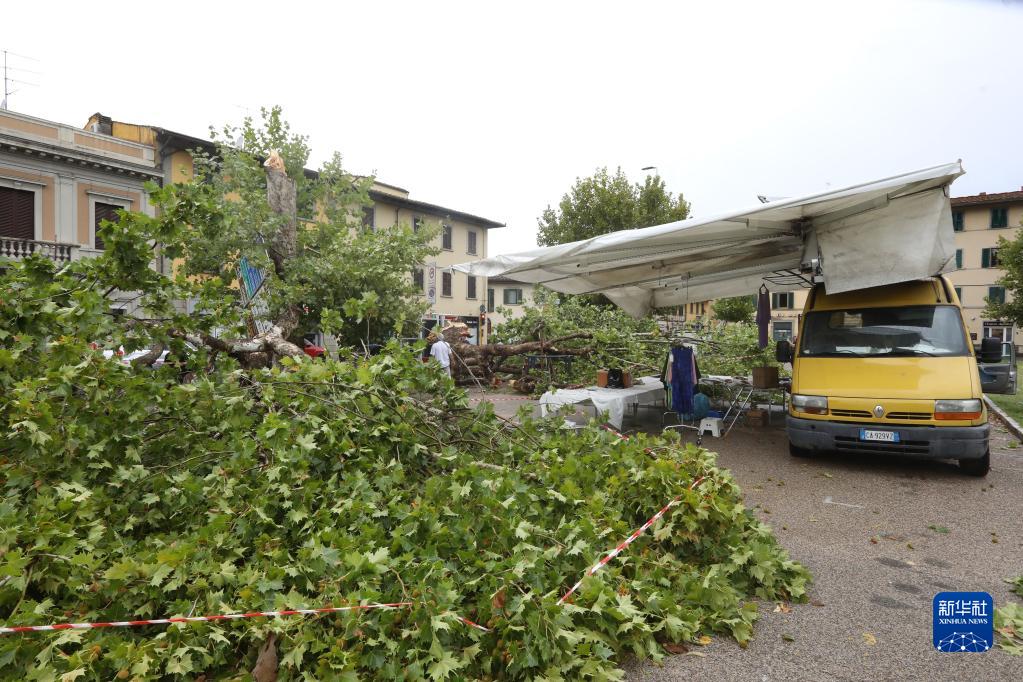 這是8月18日在意大利托斯卡納大區首府佛羅倫薩拍攝的被刮倒的樹木。
