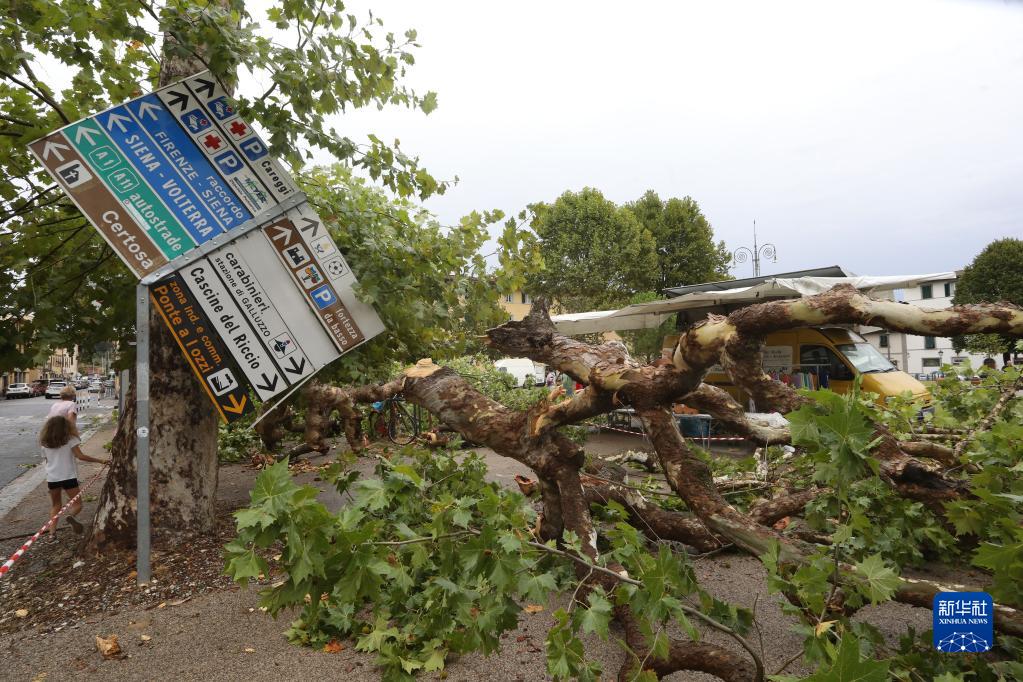 這是8月18日在意大利托斯卡納大區首府佛羅倫薩拍攝的被刮倒的樹木和路牌。