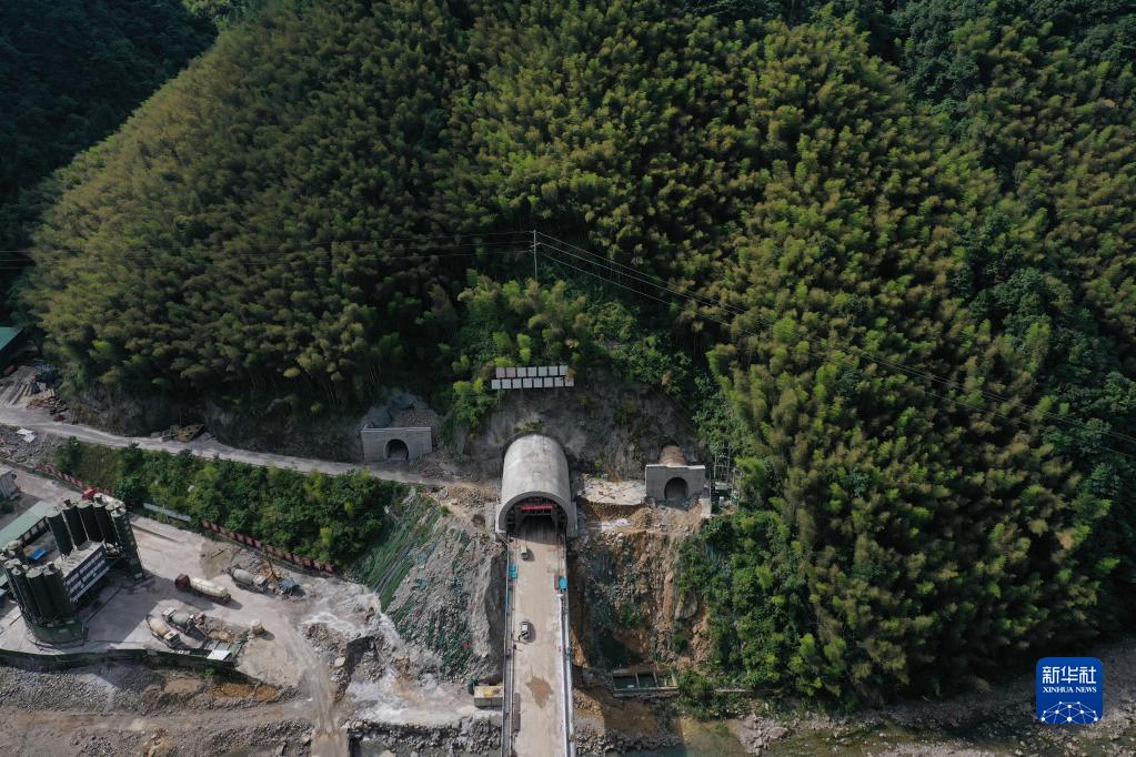 這是杭溫鐵路戶口隧道口(8月19日攝,無人機照片)。隧道進口山勢陡峭,隧道地質條件復雜,施工難度大。