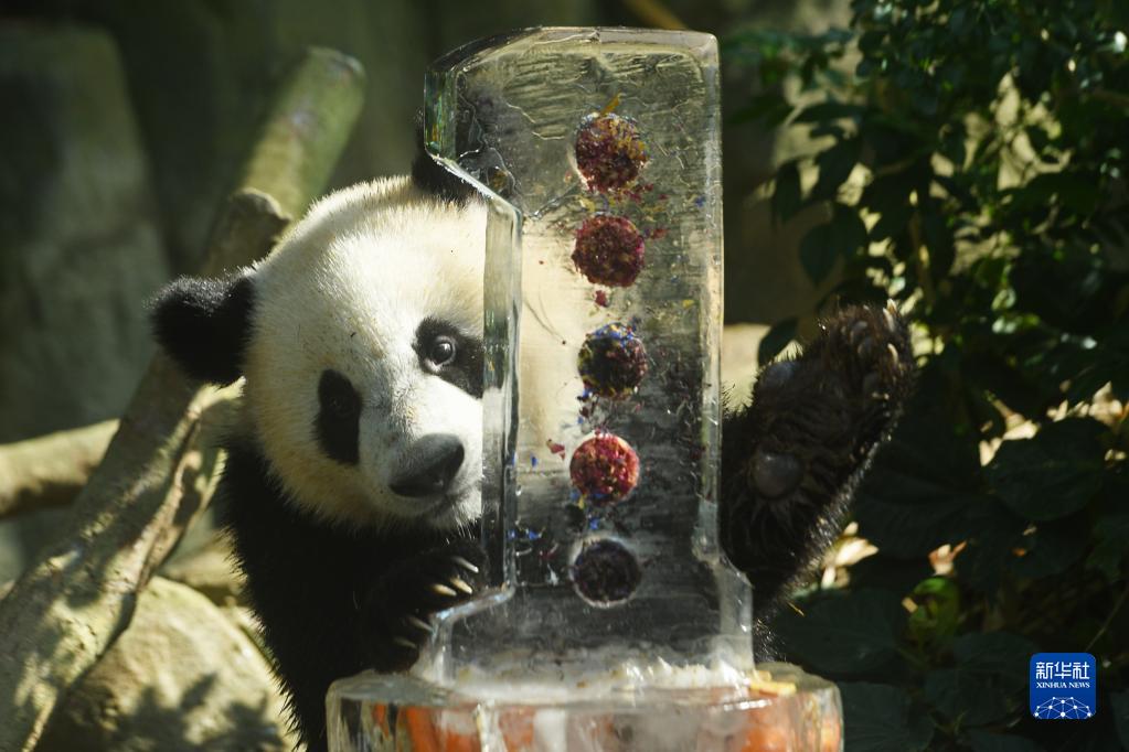 8月12日,在新加坡河川生態園,大熊貓幼崽叻叻在自己的一歲生日慶?;顒由掀穱L冰塊蛋糕。