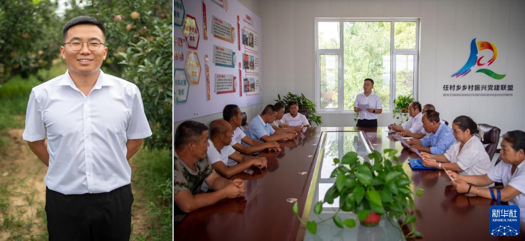 拼版照片:左圖為任村鄉碩士宣講團成員薛國進;右圖為薛國進在任村鄉東卜村進行宣講(8月19日攝)。