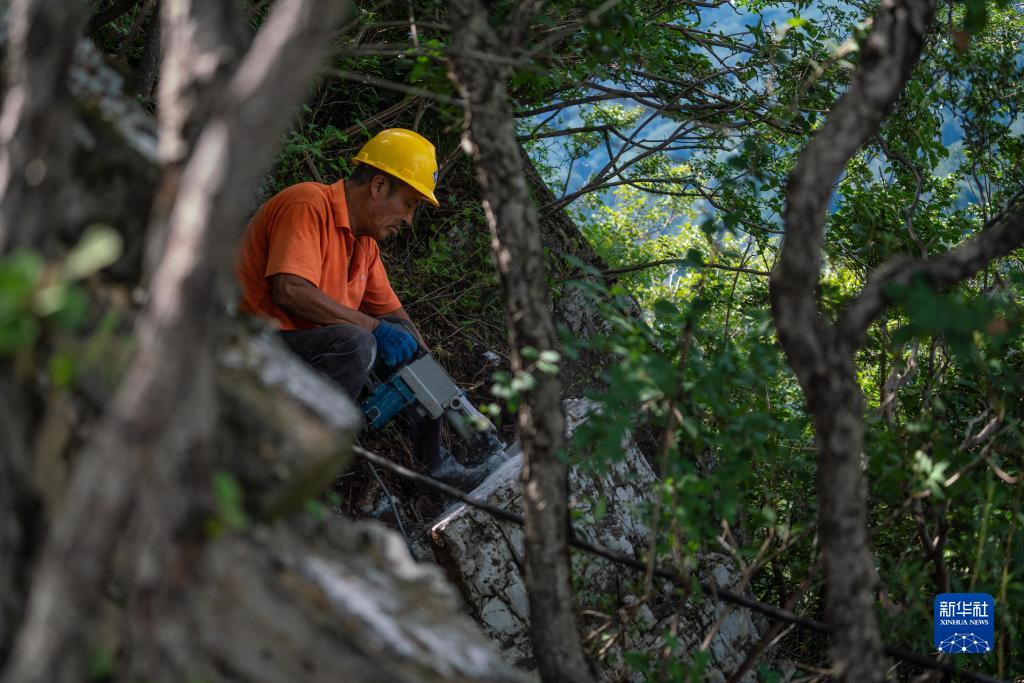 工人在“西大墻”段采集山石用作修繕石料,遵循古人“就地取材”修長城(8月16日攝)。
