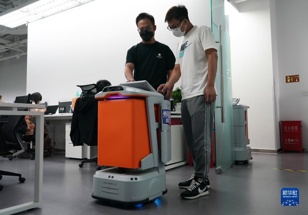 在北京市海淀區中關村東升科技園,一家商用機器人公司的工作人員在調試服務機器人(8月17日攝)。
