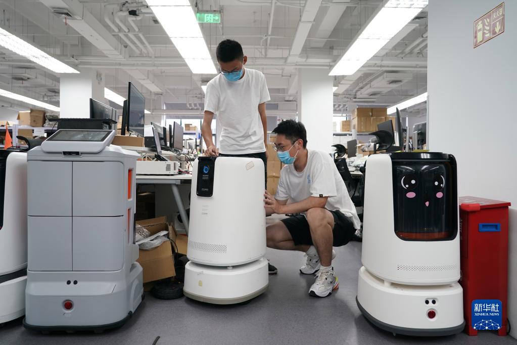 在北京市海淀區中關村東升科技園,一家商用機器人公司的工作人員在調試服務機器人(8月15日攝)。