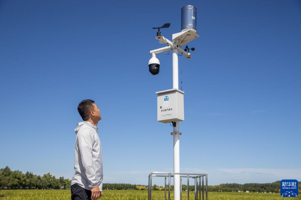8月20日,工作人員在北大荒集團閆家崗農場有限公司農業現代化示范區內檢查基于5G網絡支持下的多功能氣象站。