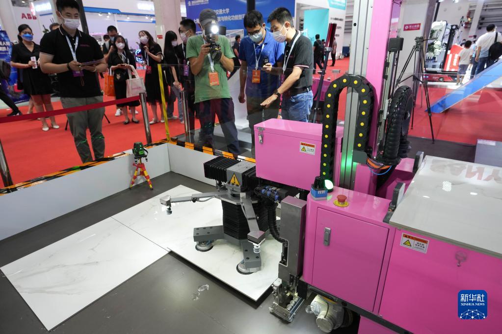 這是在2022世界機器人博覽會“機器人+建筑”區域展示的一款地磚鋪貼機器人(8月19日攝)。