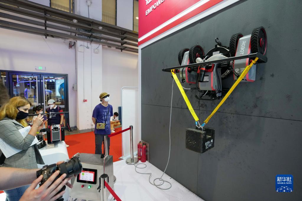 參觀者在2022世界機器人博覽會“機器人+商用”區域觀看一款水射流清理機器人(8月18日攝)。該機器人適用于船體外殼、甲板及內艙等部位的清洗除銹作業。