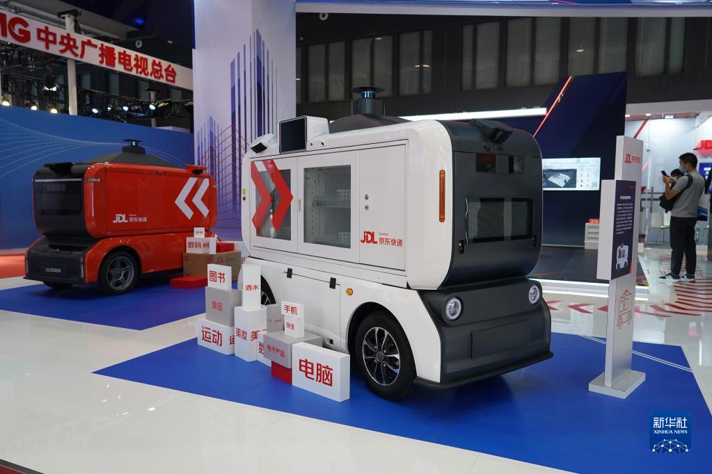 這是在2022世界機器人博覽會“機器人+物流”展區現場拍攝的智能零售車(前)(8月18日攝)。