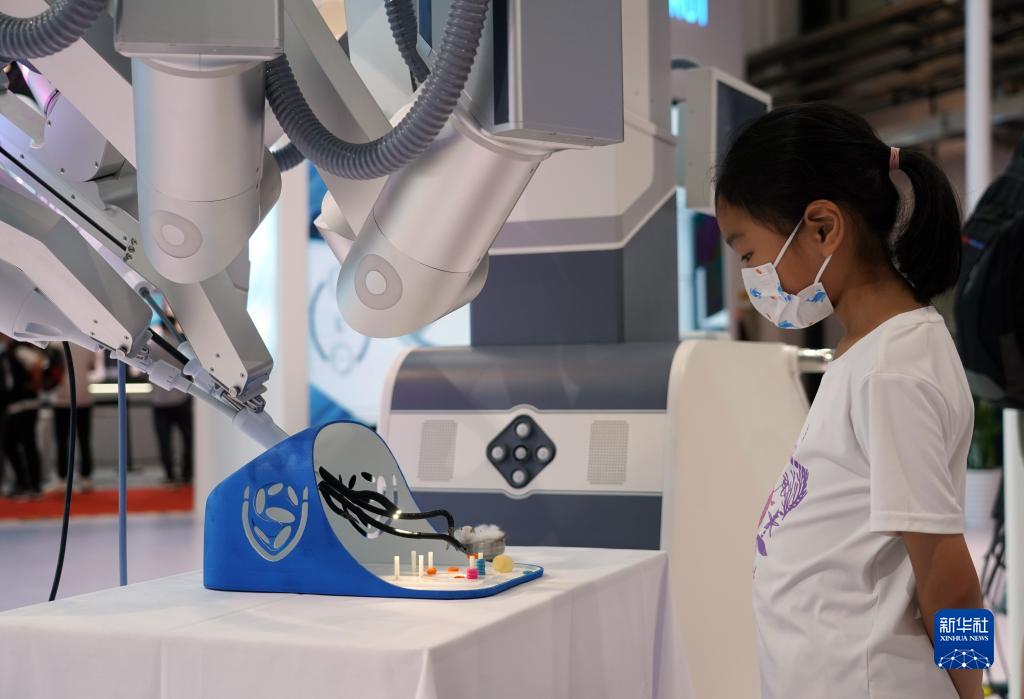 在2022世界機器人博覽會“機器人+醫療”展區現場,參觀者觀看單孔腔鏡手術機器人(8月19日攝)。