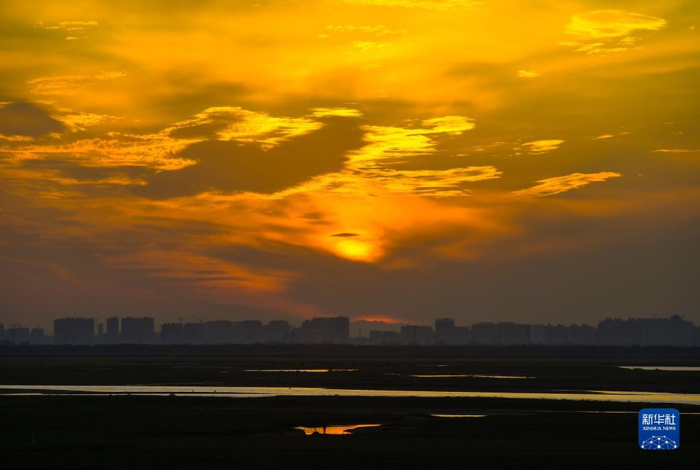 8月16日在內蒙古鄂爾多斯市達拉特旗拍攝的黃河日落景觀。