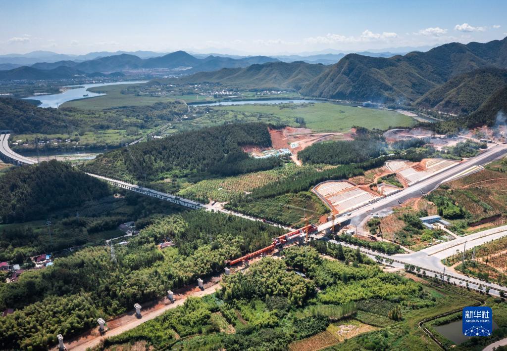 這是宣績鐵路站前二標首孔箱梁架設現場(8月21日攝,無人機照片)。