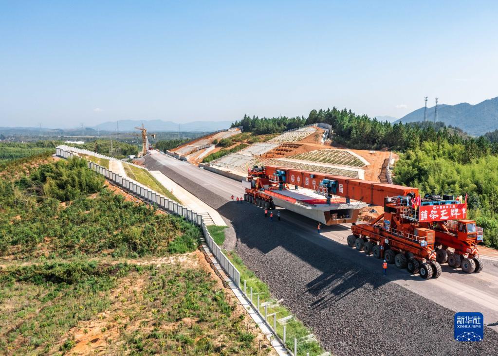 工程設備在宣績鐵路站前二標首孔箱梁架設現場搬運箱梁(8月21日攝,無人機照片)。
