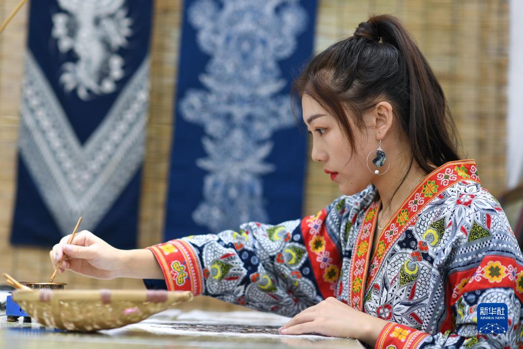 張娟娟在蠟染體驗工作室里繪制蠟版畫(8月18日攝)。