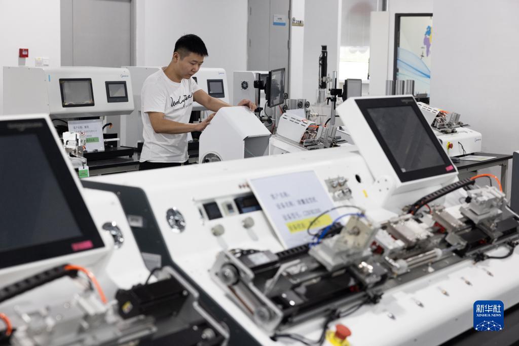 在臨港新片區生命科技產業園一處醫療設備生產車間,工人在調試醫療設備(8月18日攝)。