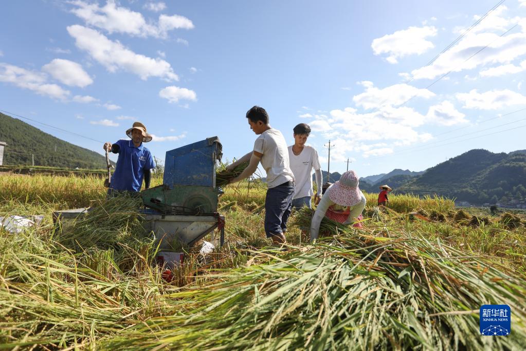 連日來,重慶市持續高溫天氣,部分地區出現不同程度的旱情。為降低影響,重慶市秀山土家族苗族自治縣溶溪鎮的農民抓緊有利時機搶收水稻,確保糧食顆粒歸倉。
