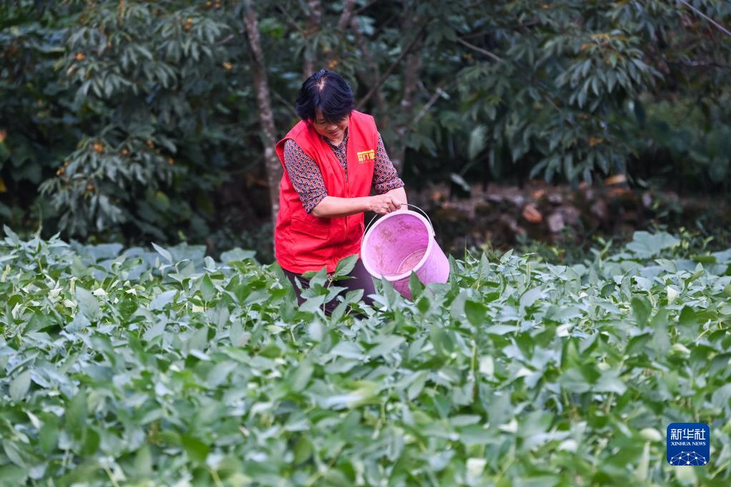 8月21日,在浙江省淳安縣屏門鄉金陵村徐家莊自然村的菜地內,黨員志愿者在澆水。