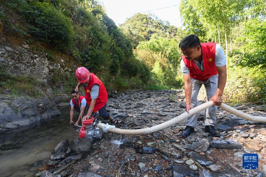 8月22日,在浙江省淳安縣屏門鄉將坑村,黨員志愿者在山間小溪里安裝抽水機和水管。