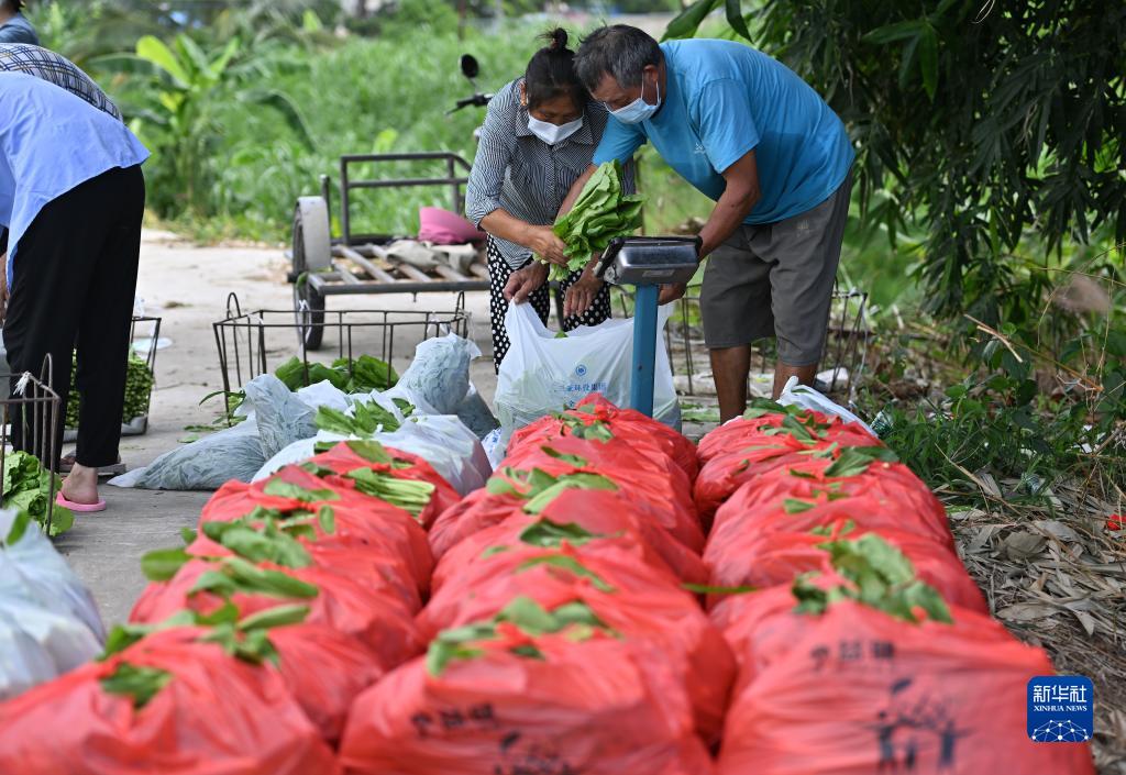 8月22日,三亞市三川葉菜產銷農民專業合作社的農民將剛采摘的蔬菜打包。