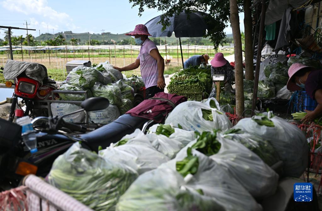 8月22日,三亞市三川葉菜產銷農民專業合作社的農民將打包好的蔬菜裝車。