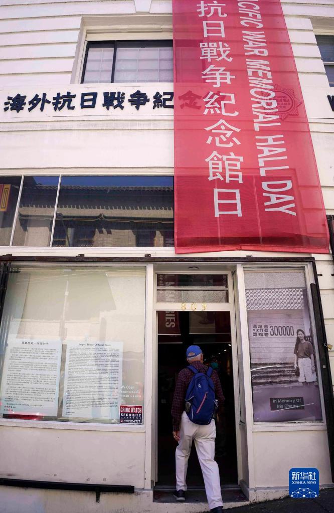 8月20日,在美國舊金山,一名男子進入海外抗日戰爭紀念館參觀。