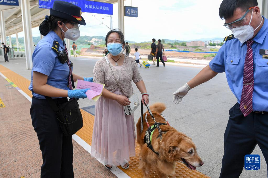 8月19日,在河源東站站臺,客運員張金宇(右)與河源東到深圳北的G2267次車列車長李雙(左)交接。