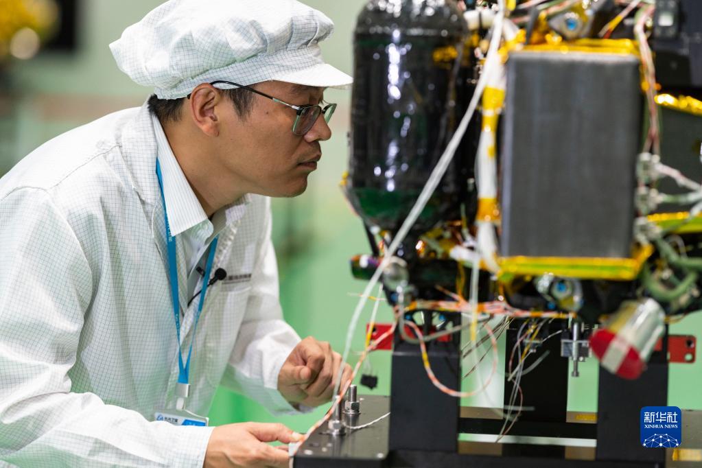 2022年8月3日,在長光衛星技術股份有限公司總裝車間,項目總師陳茂勝踏查“吉林一號”高分03衛星生產工作。
