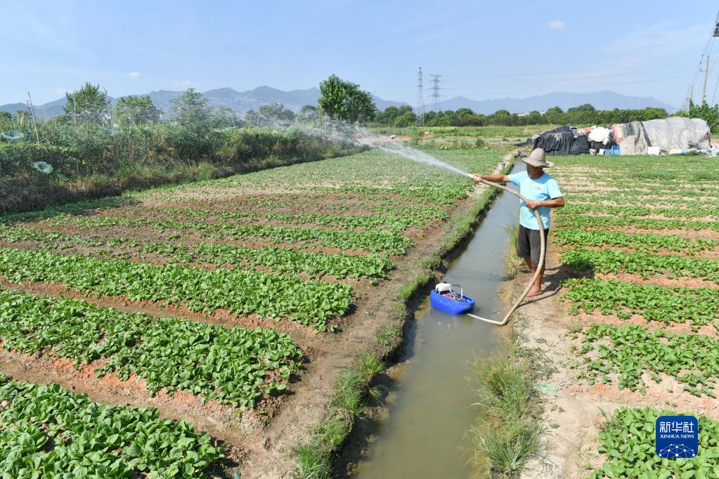 8月22日,在浙江省東陽市城東街道塘西村的農田里,蔬菜種植戶利用抽水機給蔬菜澆水。