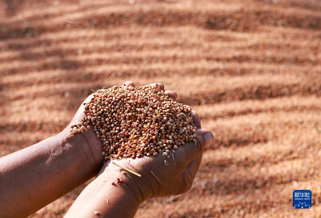 8月22日,在貴州省遵義市新蒲新區禮儀街道民主村,村民展示剛剛收獲的高粱。