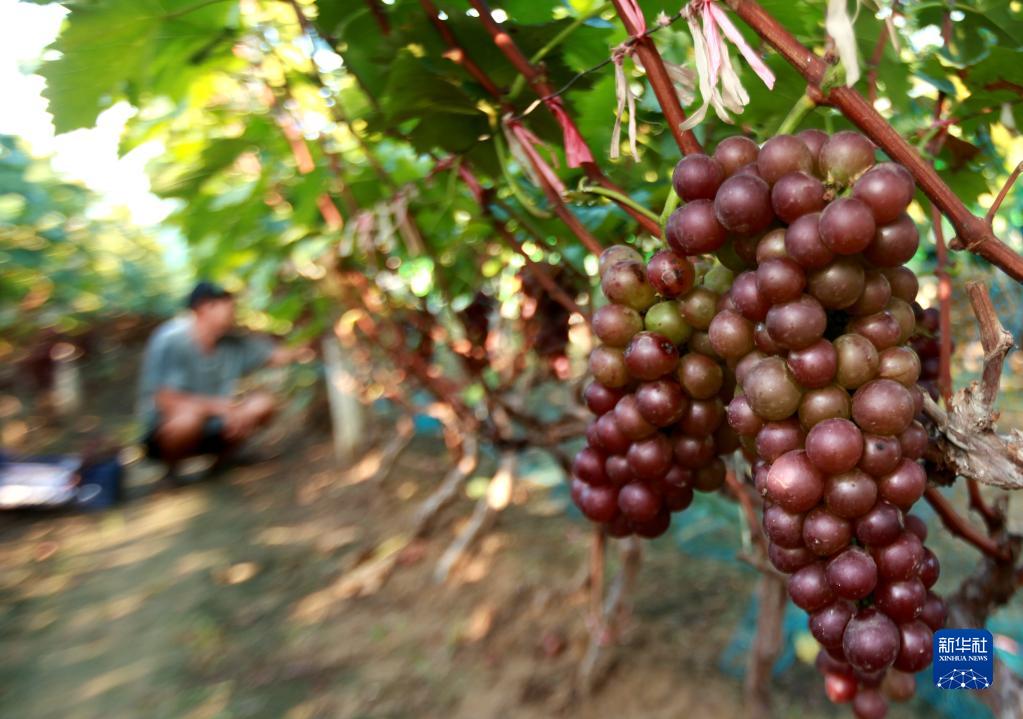 8月22日,在山東省臨沂市平邑縣地方鎮下坡村,村民在田間收獲葡萄。