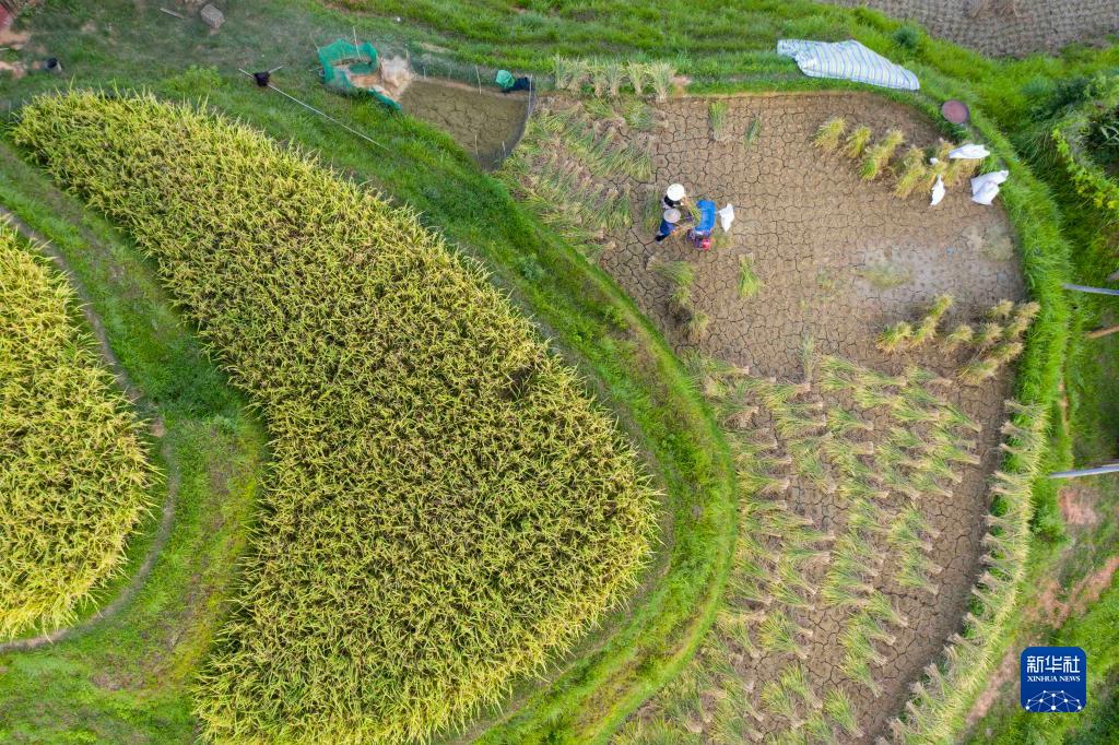 8月22日,貴州省黔東南苗族侗族自治州從江縣丙妹鎮岜沙村村民在收割稻谷(無人機照片)。