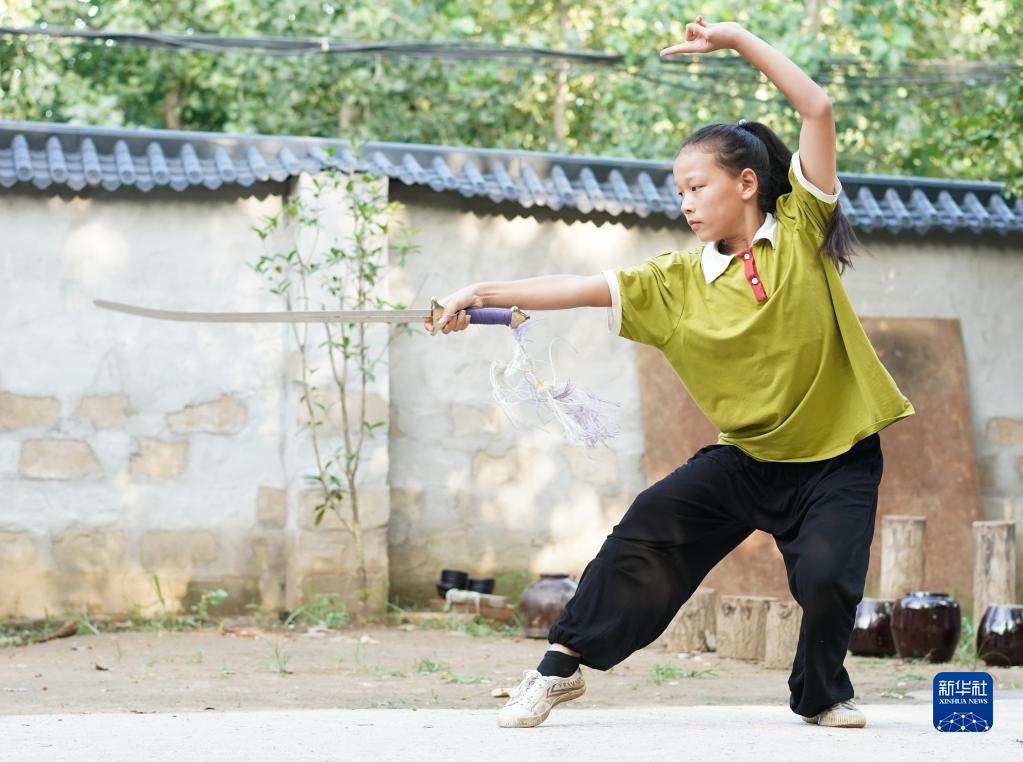 劉龍二女兒劉亦點在展示初級劍(8月16日攝)。