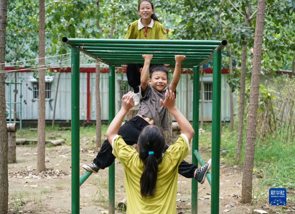 劉龍的女兒劉亦婷、劉亦點(上),兒子劉亦行(中)在練武間隙玩耍(8月16日攝)。