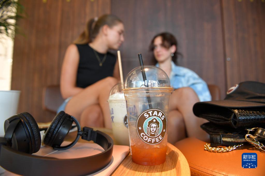 8月22日,人們在俄羅斯莫斯科一家“星咖啡”門店用餐。