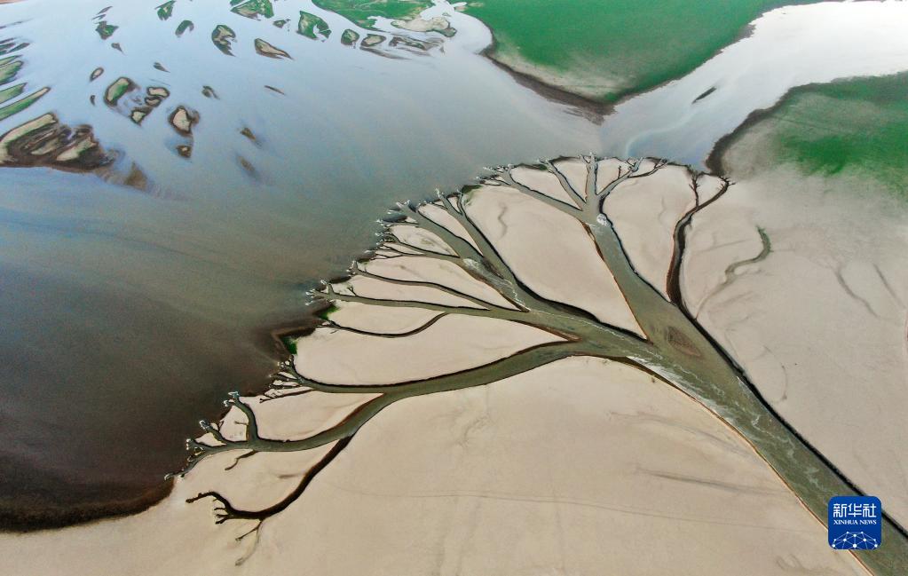 受連日高溫少雨天氣影響,中國最大淡水湖鄱陽湖水位持續下降。鄱陽湖進賢段水域灘涂在水流分支的沖刷下,呈現出栩栩如生的“大地之樹”景觀。