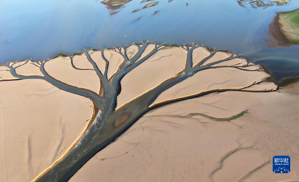 受連日高溫少雨天氣影響,中國最大淡水湖鄱陽湖水位持續下降。鄱陽湖進賢段水域灘涂在水流分支的沖刷下,呈現出栩栩如生的“大地之樹”景觀。