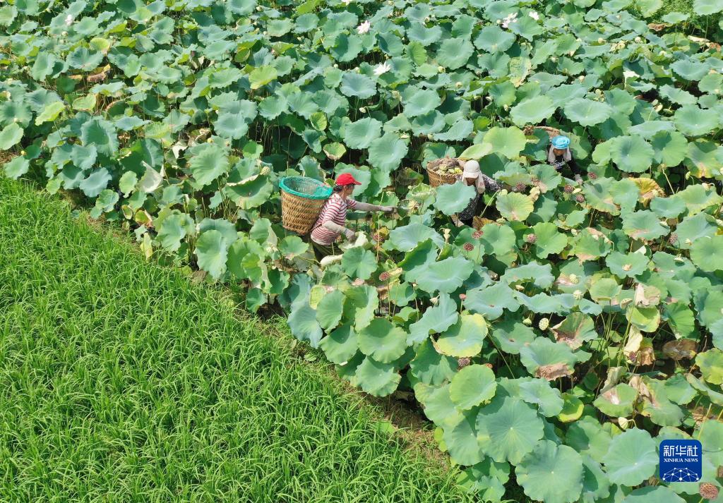 8月23日,湖南省永州市道縣梅花鎮貴頭村的村民在采摘蓮蓬(無人機照片)。